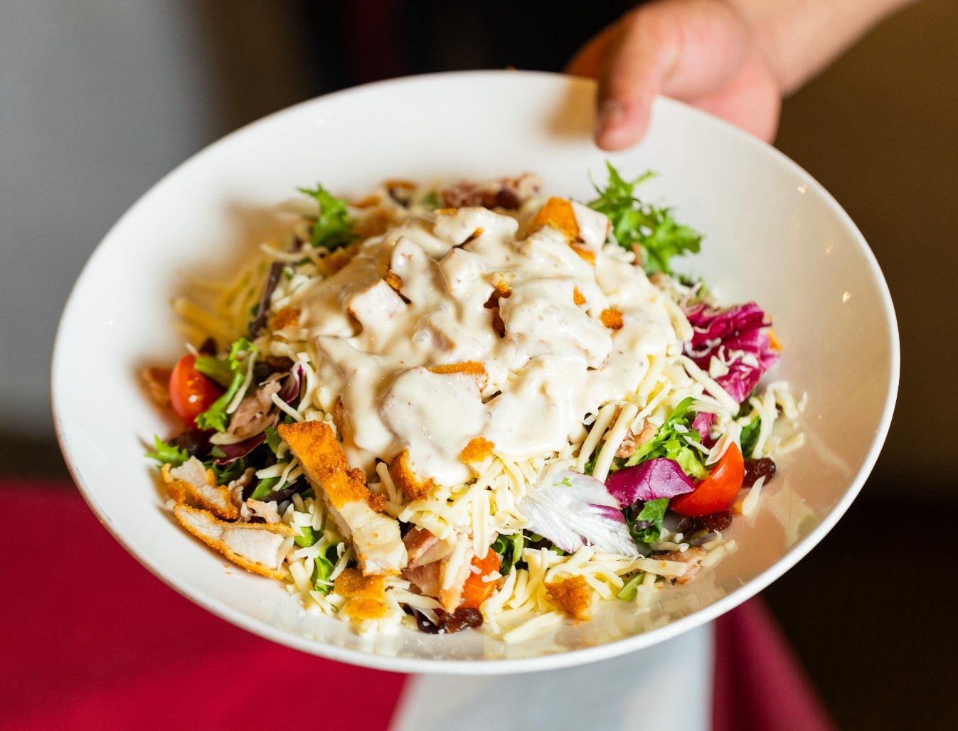 (mezclun, raisins, bacon, cherry, fried chicken, cherry)