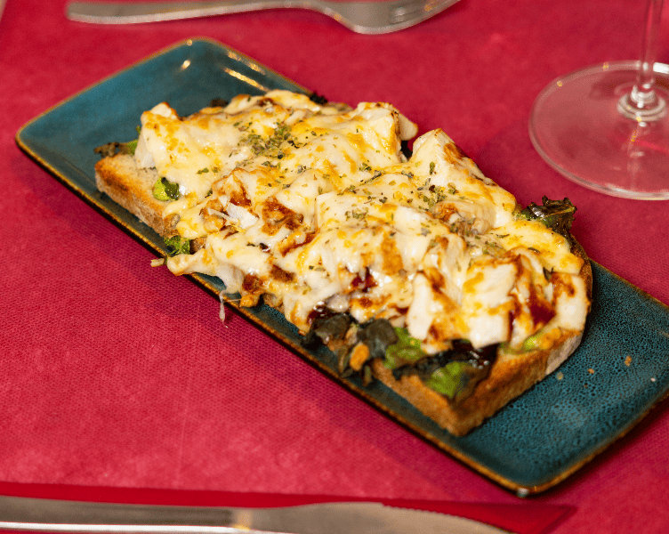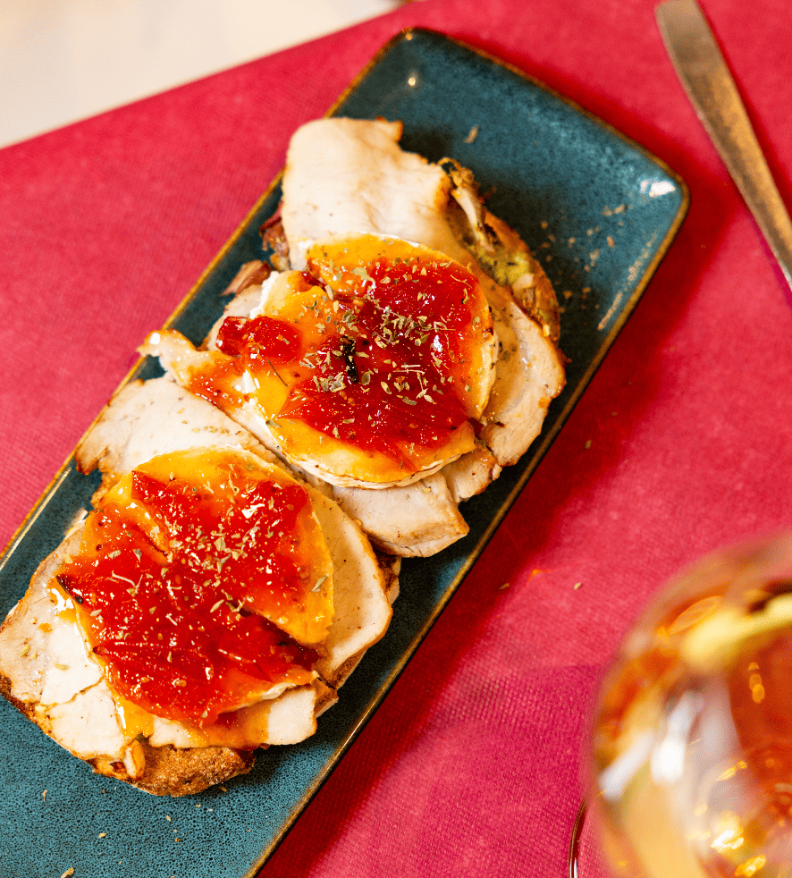 Ali oli, mixlum, lombo de porco, queijo de cabra, cereja de tomate de geléia