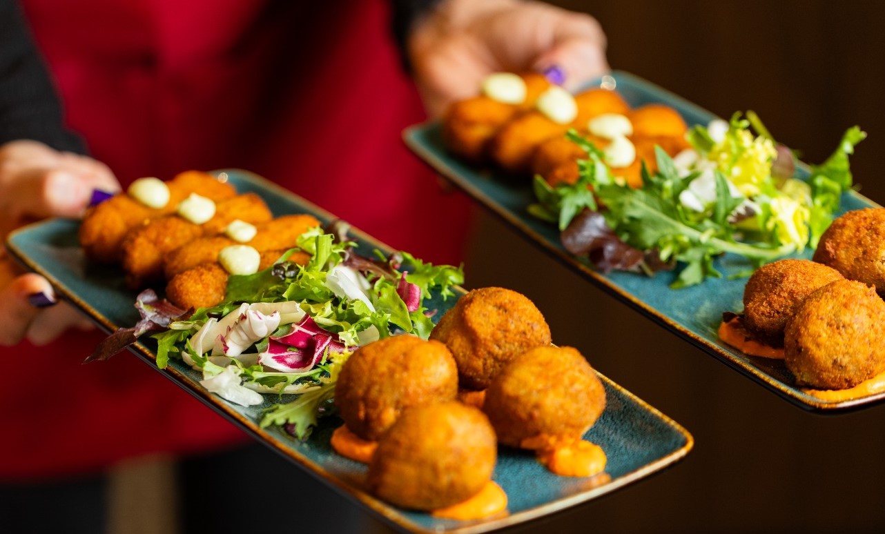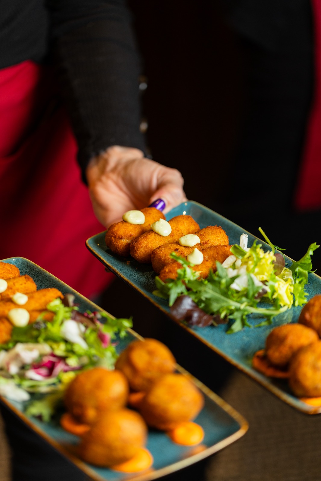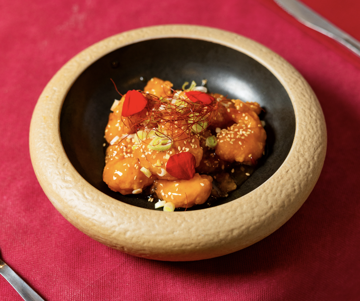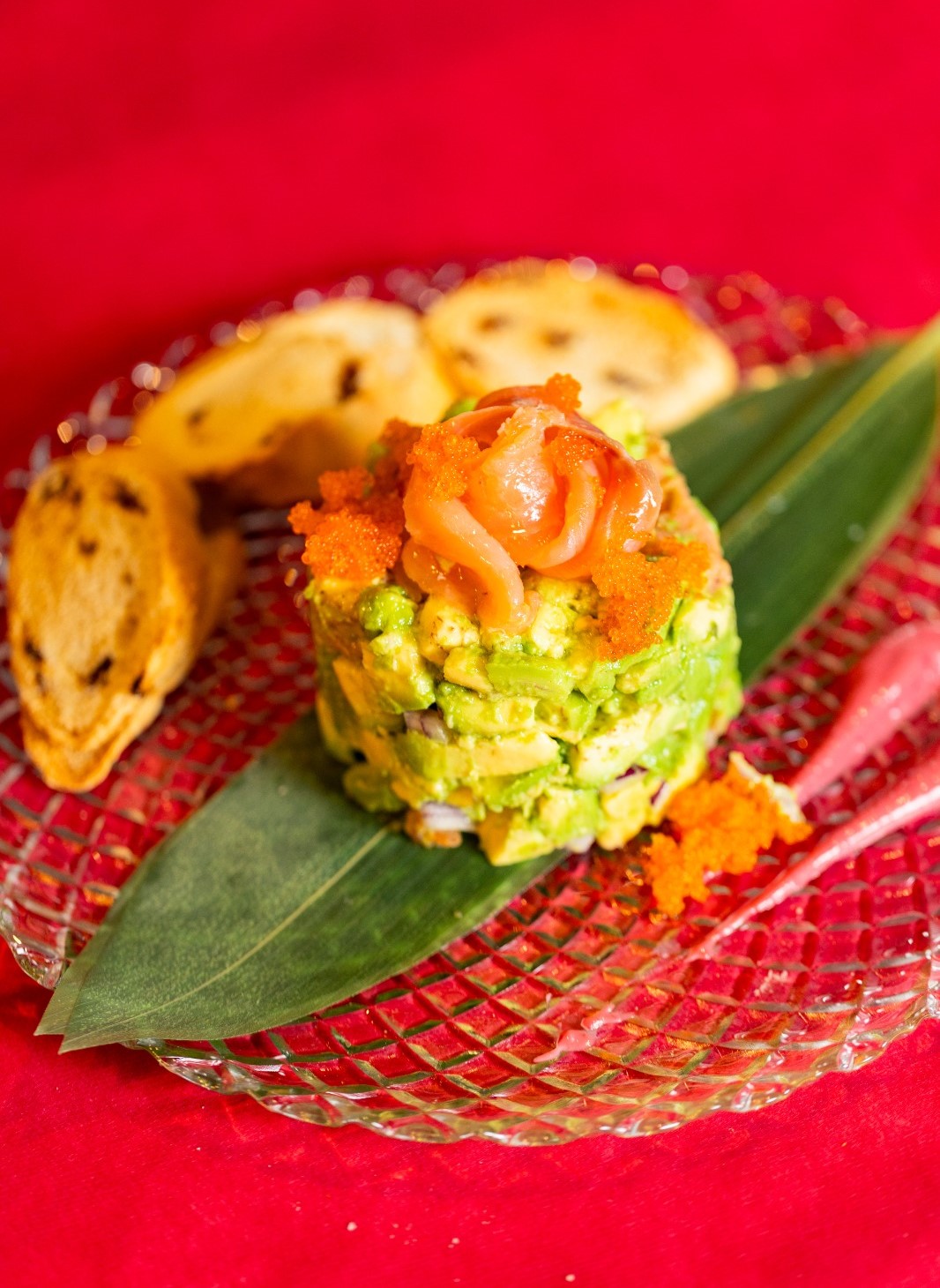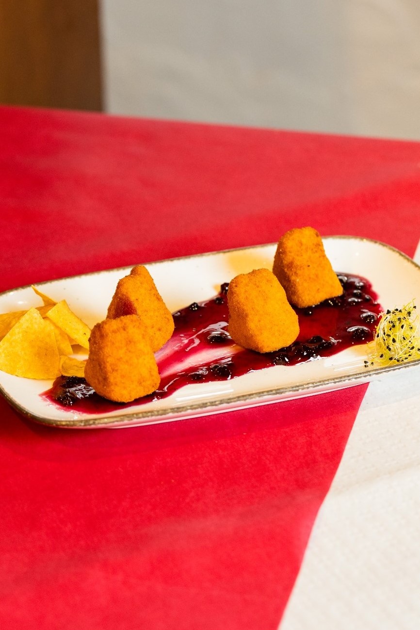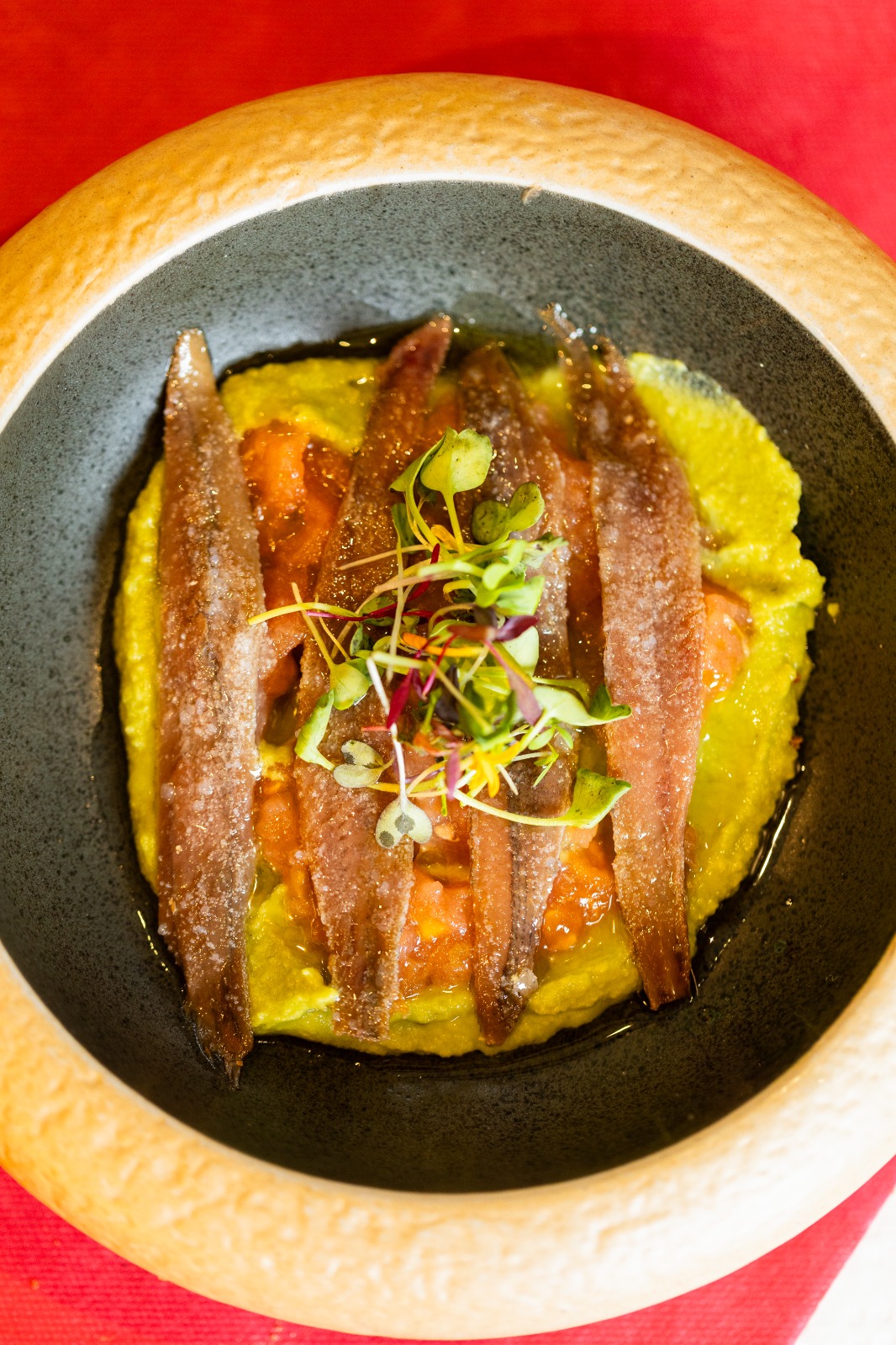 Geröstete nudeln mit garnelen und alioli -piquillo -sauce