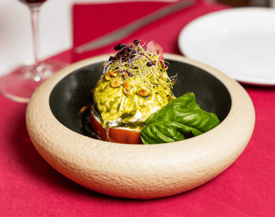 Karamellisierte castellano -tomate, italienische burrata, pesto casero