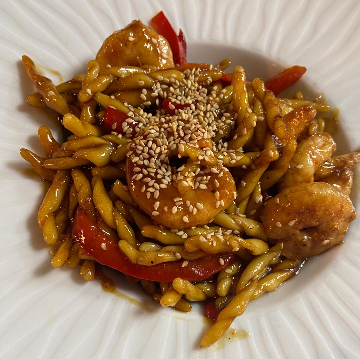 Fresh trofie pasta, fresh peppers, wok sauce, prawns
