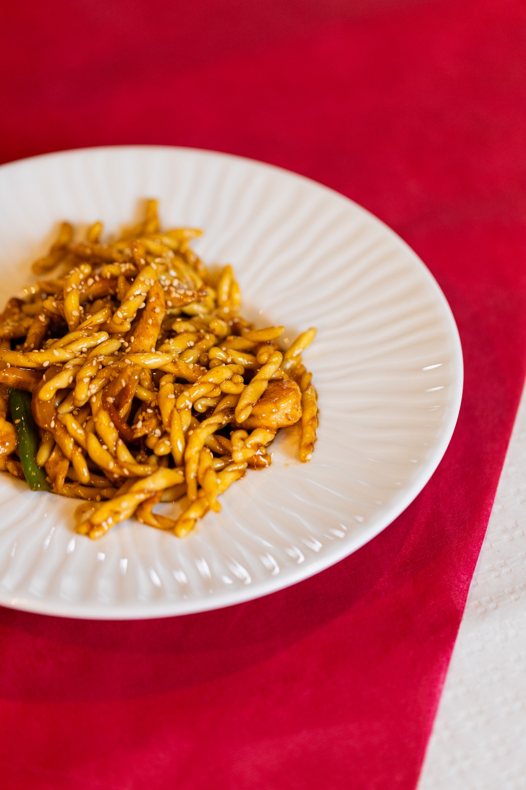 Fresh trofie paste, fresh peppers, chicken, wok sauce