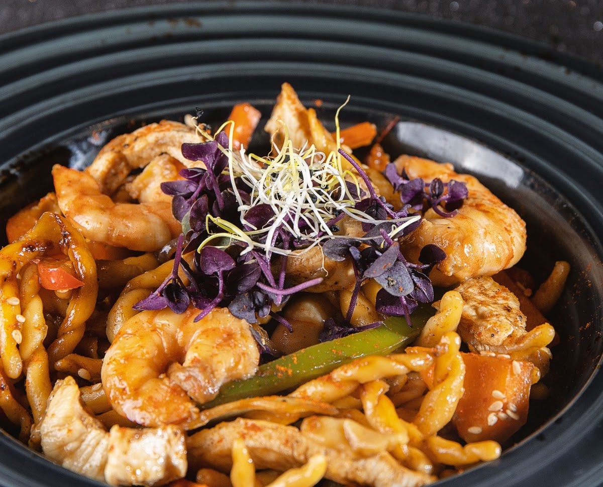Fresh trofie pasta, fresh peppers, wok sauce, chicken, prawns